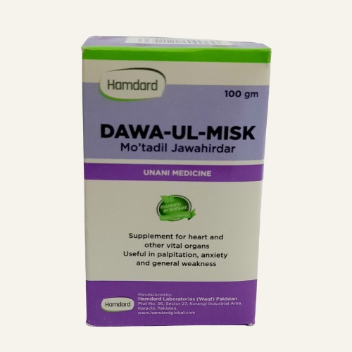 Dawa-ul-Misk Mo’tadil Jawahirdar is a premium Unani tonic for general weakness, palpitation, and mental stress. It revitalizes the heart and nervous system. 100 gm container.