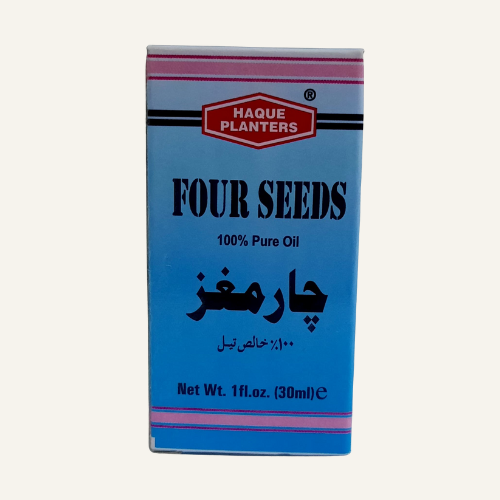 Four Seeds Oil is a multi-purpose hair tonic combining the benefits of four herbal seed extracts. It enhances hair growth, reduces dandruff, and strengthens the scalp. The oil also prevents split ends and adds natural shine. Available in a 30 mL bottle.