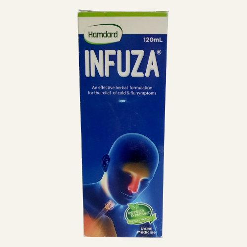 Infuza is an effective Unani syrup designed to counter the common symptoms of cold, influenza, and seasonal viral infections. Its herbal ingredients help reduce nasal congestion, body aches, and inflammation in the throat. The syrup promotes rapid recovery by strengthening the immune system and supporting the respiratory tract. It is especially helpful during weather changes or in cases of early viral infections. Infuza also reduces fever and enhances overall comfort during illness. This flu-relief formulation is packaged in a 120 mL bottle.