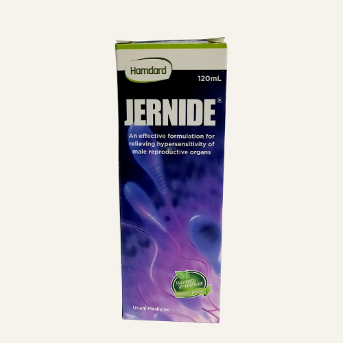 Jernide is a Unani syrup designed to address hypersensitivity of male reproductive organs. It helps balance glandular function and reduce nervous irritability. The syrup promotes reproductive wellness and hormonal balance. It is offered in a 120 mL bottle.
