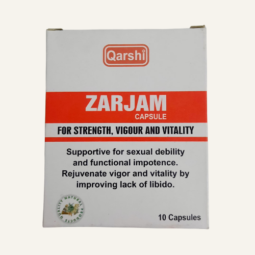 Zarjam is a high-potency Unani capsule formulated to restore male vigor, stamina, and overall vitality. It strengthens the reproductive system, increases libido, and improves performance by rejuvenating the nerves and muscles. Zarjam is especially effective in cases of sexual fatigue, low energy, and decreased confidence. The carefully blended ingredients boost blood circulation, enhance hormonal health, and provide long-lasting endurance. Ideal for adult males facing stress-induced or age-related debility. Each bottle contains 10 capsules delivering holistic rejuvenation and masculine enhancement.
